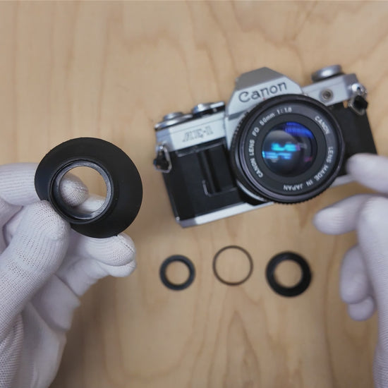 Las gomas originales para los ojos de la serie Canon A hoy en día casi no se encuentran en buen estado. Por eso hemos desarrollado una solución que combina un adaptador hecho con impresión 3D con una goma moderna para el ojo. El juego se desliza fácilmente sobre el ocular de tu cámara y queda firme. Proporciona una visión cómoda, protege las lentes de tus gafas y bloquea la luz ambiental molesta.