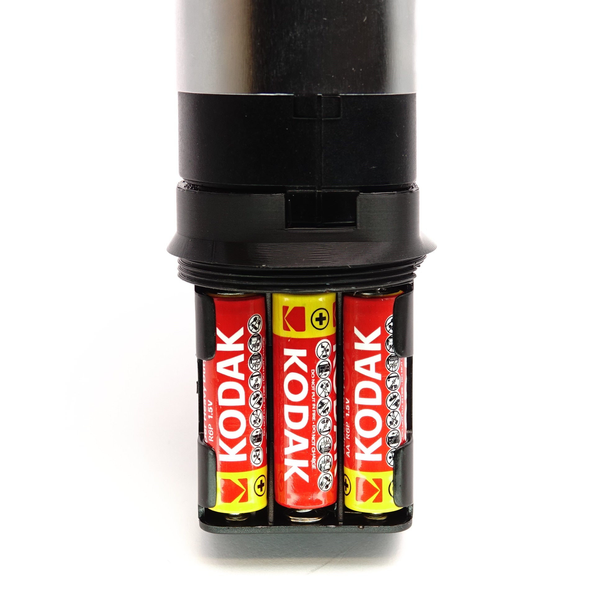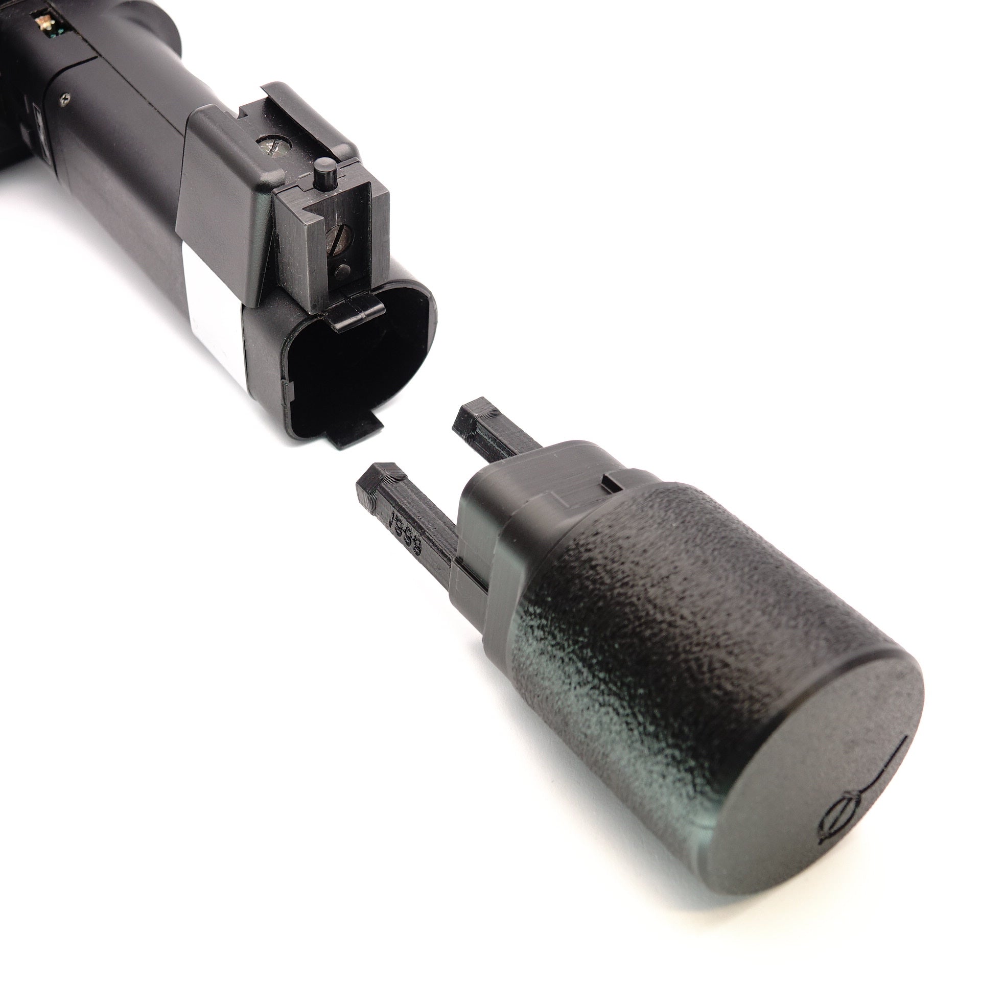 Ce porte-piles est fabriqué comme un remplacement robuste pour le porte-piles original Metz 45-39. Il est fait en plastique technique (PLA+) et offre un maintien stable pour 6 piles AA. Le fond se dévisse pour changer rapidement les piles.