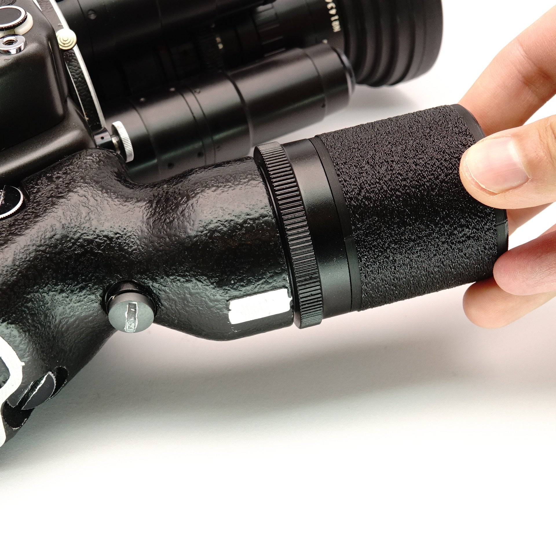 Come ingegneri abbiamo migliorato notevolmente il design: il tappo terminale ora è dotato di una filettatura metallica massiccia. Così il problema delle filettature in plastica usurate o strappate è solo un ricordo. Questo rende l’adattatore estremamente durevole e garantisce una presa salda anche quando sul set si lavora in fretta. Per l’uso consigliamo 5 batterie NiMh di alta qualità (ad esempio Eneloop Pro o EBL 1100mAh). Questa configurazione fornisce energia sufficiente per circa 17-18 bobine di pellicola da 100ft e assicura una tensione stabile.